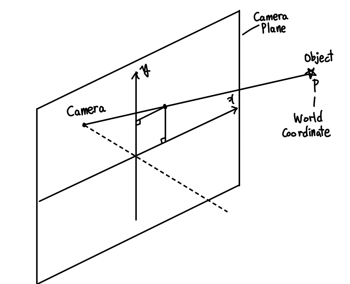그림과 같이 카메라, 카메라 평면(화면), 그리고 미로 상의 한 점이 존재한다고 하자.